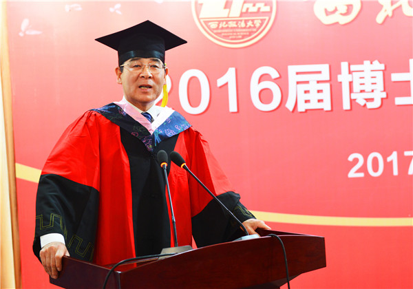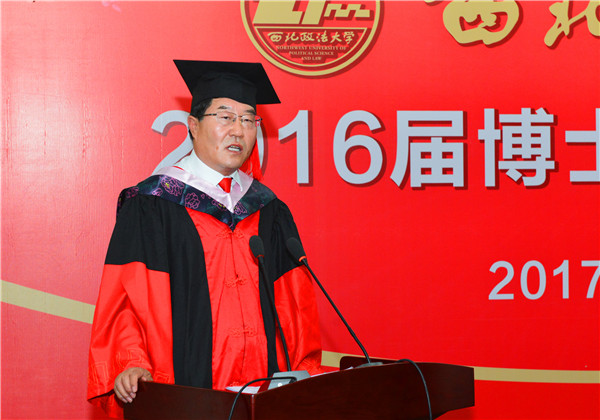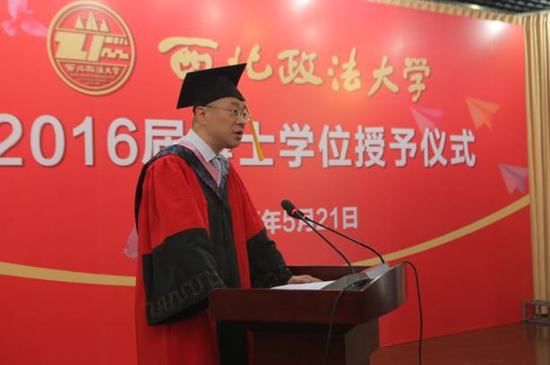 5月21日下午,我校2016届博士学位授予仪式在长安校区校务楼报告厅举行。校党委书记宋觉,校长、校学位评定委员会主席贾宇,校党委副书记赵健,副校长王麟,校学术委员会主任委员、资深教授赵馥洁以及校学位评定委员会委员、博士生导师、各法学院院长,校党政办、宣传部、科研处、教务处、学工部、校友工作办等部门负责人,在读博士生和硕士研究生代表参加仪式。陕西省人大常委会党组副书记、副主任、博士生合作导师安东,陕西警官职业学院院长、博士生导师杨宗科应邀参加仪式。授予仪式由校学位办主任、研究生院院长、研工部部长王健主持。